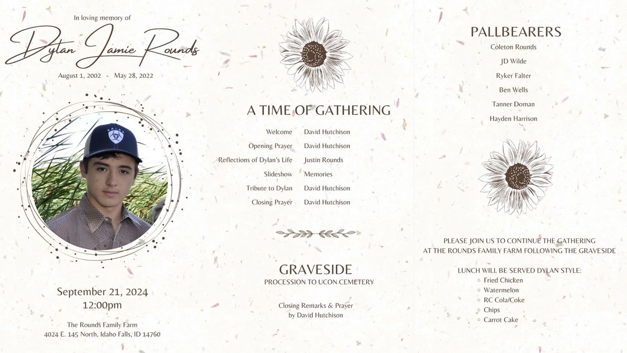 The memorial for Dylan Rounds was held on September 21, 2024 at the Rounds Family Farm in Idaho.